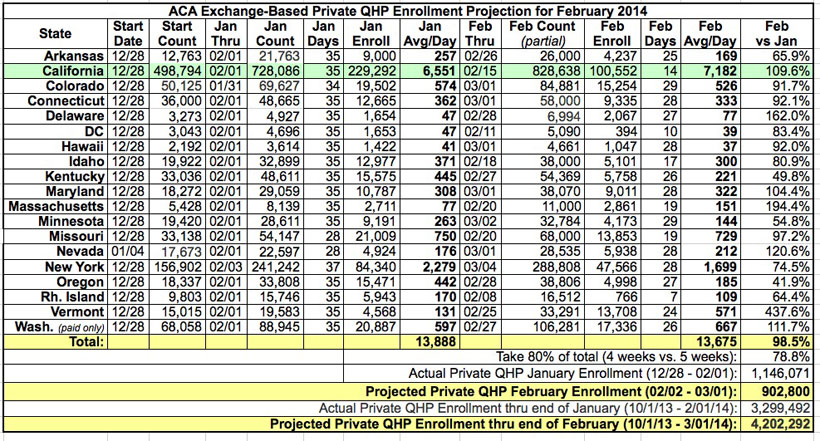 California was averaging 7,182 QHP enrollments per day in the first half of February; they hit 828,638 QHPs as of 2/15.