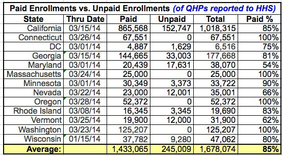 UPDATE 3/27/14: Connecticut announced yesterday that they've purged their 5,000 unpaid enrollments to date...out of 72,551 total...or less than 7% unpaid. Assuming the cleaned-up number is the one reported to HHS for March, they join MA & WA as having 100% paid enrollments: