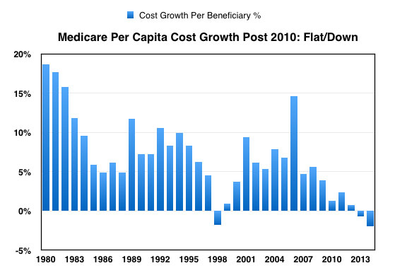 Evidence is mounting that per beneficiary Medicare costs are flattening or dropping. The chart above shows the trend in per beneficiary cost growth since 1980. Before now, the only "off trend" period was 1998-1999. Turns out this short drop in cost growth was caused by the 1997 Balanced Budget Act, which significantly adjusted and cut payment rates. Providers complained loudly, and the Balanced Budget Refinement Act of 1999 reduced many of these cuts and put Medicare back on its strong annual growth in spending per beneficiary.