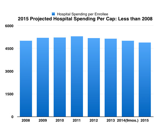 From this she put together the following chart, showing how per beneficiary spending has flatlined in the Hospital Insurance portion of Medicare: