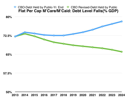 With zero per capita spending growth - in other words, with Medicare and Medicaid spending growing only with enrollment - Debt to GDP ratios drop gradually over the 10 year period. Budget deficits stay below GDP growth, allowing the debt ratio to improve.
