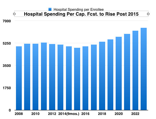 But this is a far cry from what CMS and the CBO are forecasting. Here's CMS' forecast for per capita Hospital Spending: