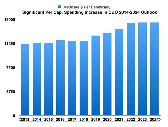 So moving back into the Medicare/Medicaid cost forecasting arena, do you agree withCMS and the CBO that per beneficiary costs will restart their historical 3-5% growth trend? I don't. If I'm right, how long will it take the system to catch up and adjust their forecasts? I can't say, but my guess is: 2-3 years at a minimum. Democrats will, quite rightly, push this in the 2016 election, if per capita costs stay flat for Medicare and Medicaid. Conservatives will trumpet the news loudly when overall healthcare spending moves up, due to the large ACA coverage expansion . Progressives will need to work hard to keep the focus on per capita costs, not total spending.