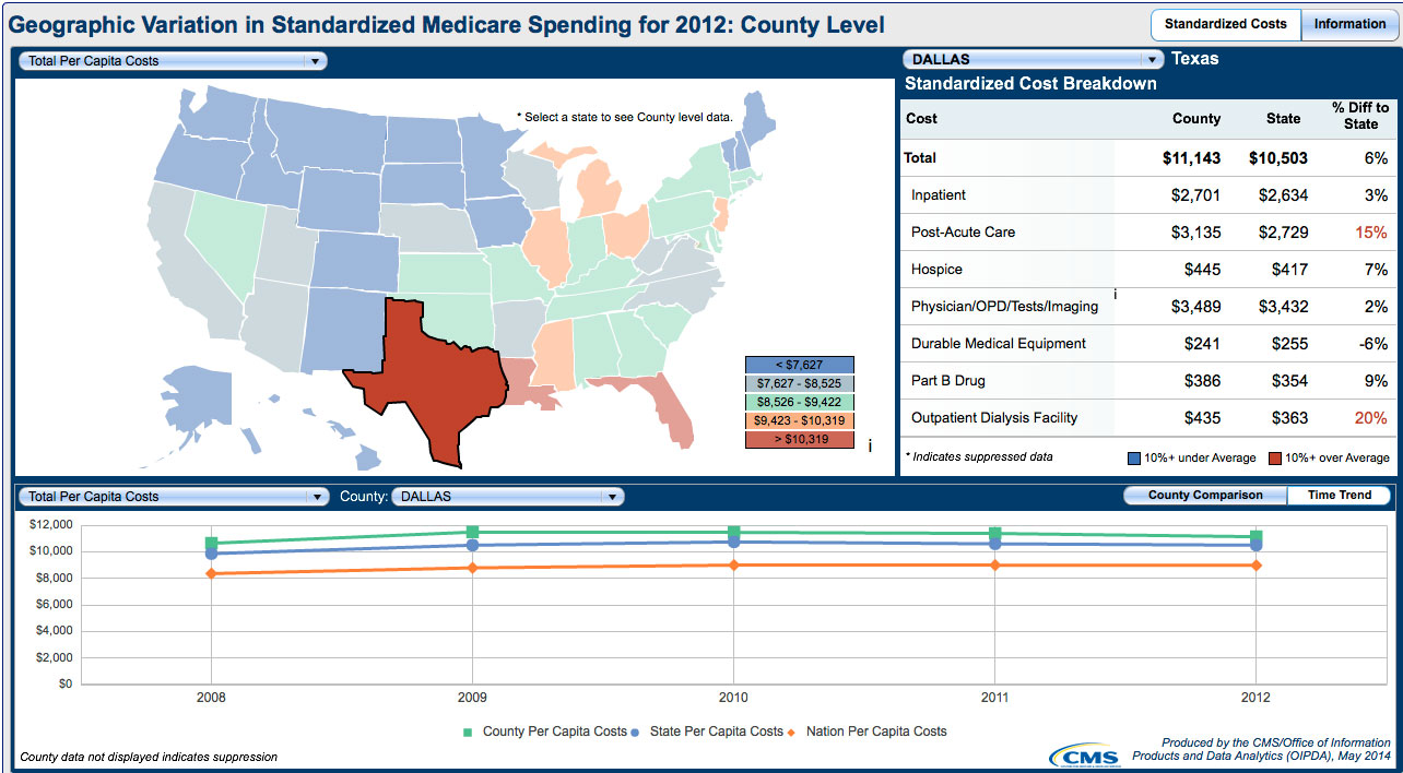 First, it's essential to understand what we're looking at (and here, I will focus on Medicare): when reviewing Medicare "spending trends", you are not really looking at spending; rather you are seeing provider billing information. Providers treat patients, then bill Medicare per a preset pricing list according to diagnostic related groups, or DRG's. Medicare spending is a country-wide buildup, provider by provider, of DRG's billed for services provided. The actual costs of providing those particular mix of services are nowhere reflected in Medicare billing. Spending over the allowed DRG limit is simply shifted to other patient categories (private insurance, private pay, charity). Almost all providers bill above the allowed per-DRG Medicare rate; but costs for the more efficient providers can line up with these DRG rates.
