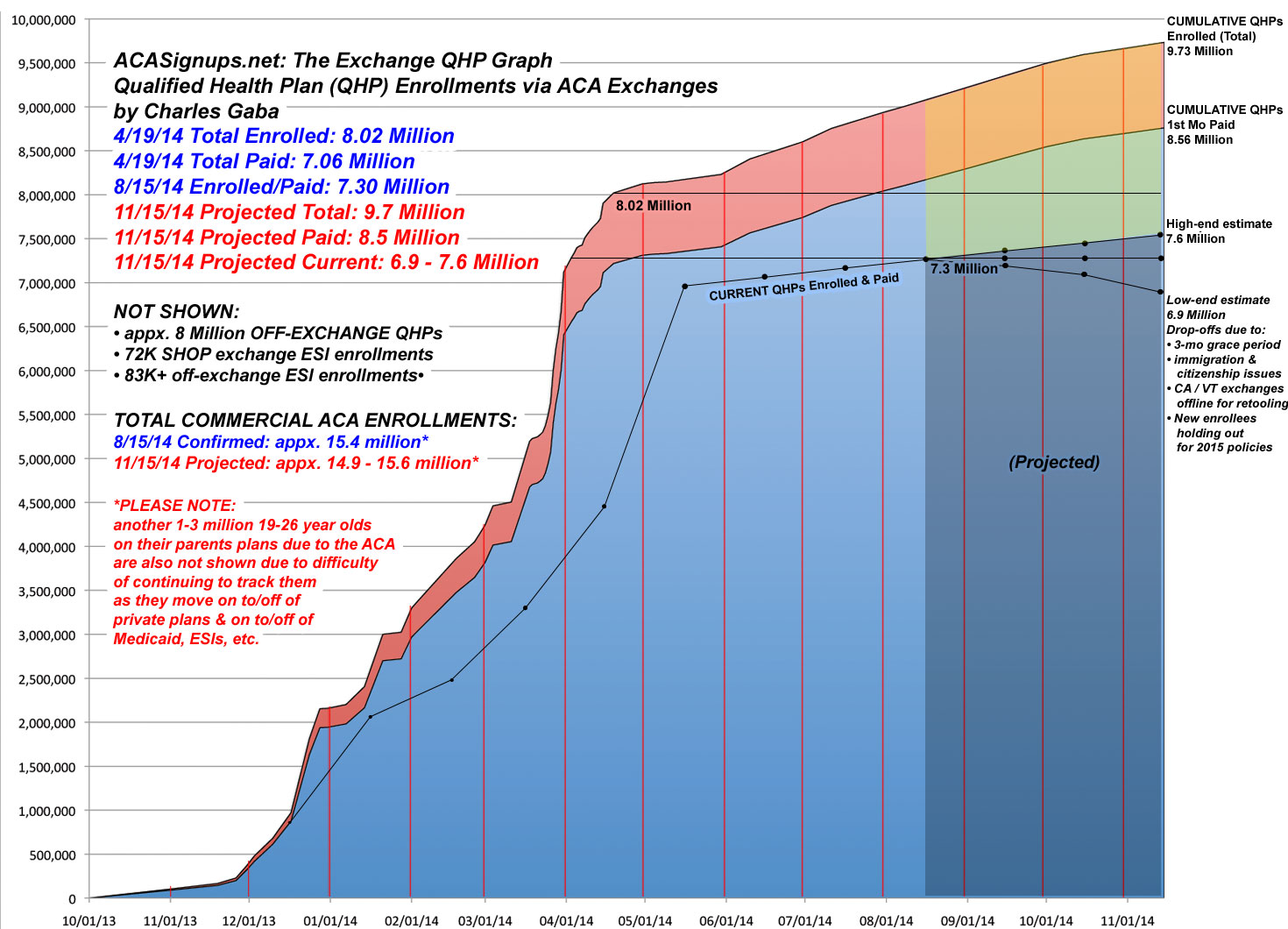 In September, HHS Secretary Sylvia Burwell surprised everyone (including myself) by finally tossing out a key data nugget: 7.3 million people were "currently enrolled and paying" for their ACA policies "as of August 15th". The fact that this was the only data point issued led some ACA critics, particularly Bob Laszewski and Megan McArdle, to suggest that the timing of that announcement was no coincidence. They figured that because the ACA allows a 90-day grace period before insurers are allowed to kick people off the rolls, that there may have been a ton of people whose policies started in May, who paid for 1 or 2 months, then stopped paying at all, leading the insurance companies to drop their policies in August or September.