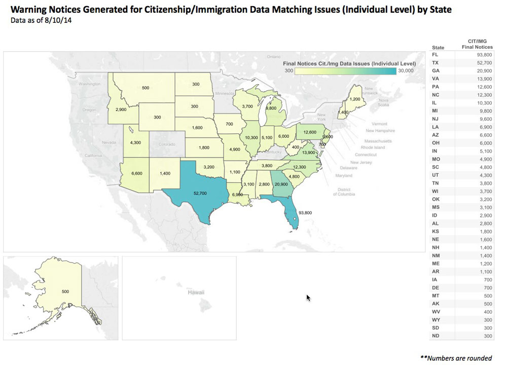Secondly, look at California. I wrote up an entire article over at healthinsurance.org about California's own immigration/citizenship data issues...and in their case, out of over 148,000 enrollees who originally had problems, only 7% ended up actually having their policies cancelled in the end (87% were resolved without cancellation; another 6% awere still under review at that time).