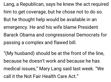 • Lang notes that in addition to his new medical bills, he also already has a bunch of existing hospital bills and zero income since December due to his medical problems, so he owes money to family/friends/neighbors due to his car being reposessed. Quite frankly, Lang and his wife appear to be in the exact same situation as millions of other people across the country. The difference, of course, is that most of those other folks weren't foolish enough to deliberately avoid any sort of health insurance until they got into a jam. It's one thing to not be able to afford coverage or to be denied it due to a pre-existing condition, but the Langs specifically stated that they went out of their way to avoid doing so until it was literally too late.