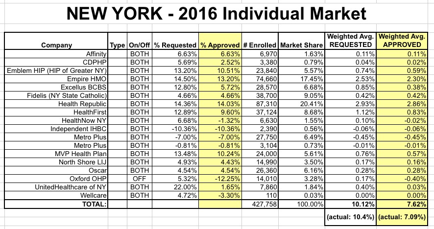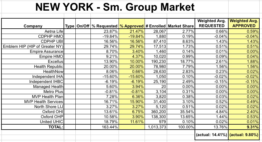 Just 2 days ago I posted an analysis of the New York individual market rate increase requests for 2016. My takeaway was that the weighted average requested was 10.0%, with the usual caveats about rounding errors, estimates of the total individual market size and so forth. Plus, of course, these were just requested increases, not final ones.
