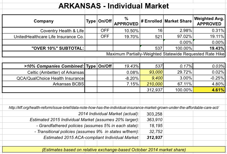 A couple of weeks ago I noted that only 2 AR companies even requested hikes of more than 10%, and only a few hundred people are currently enrolled in those policies anyway. Based on this, plus the informed opinion of local reporter David Ramsey (an expert on all things ACA-related in Arkansas), I projected a weighted average rate increase request of perhaps 4% overall.