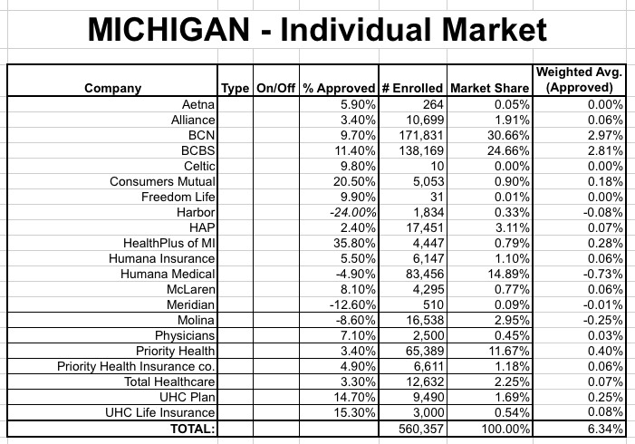 Well I'll be damned. Given all the tea leaf/entrail-reading that I've had to do in some states to try and piece together the weighted average rate increases for 2016 (usually due to missing enrollment/market share data for the companies participating), it's a pleasant surprise to see that my own state of Michigan has posted the approved rate hikes without any gobbledygook:
