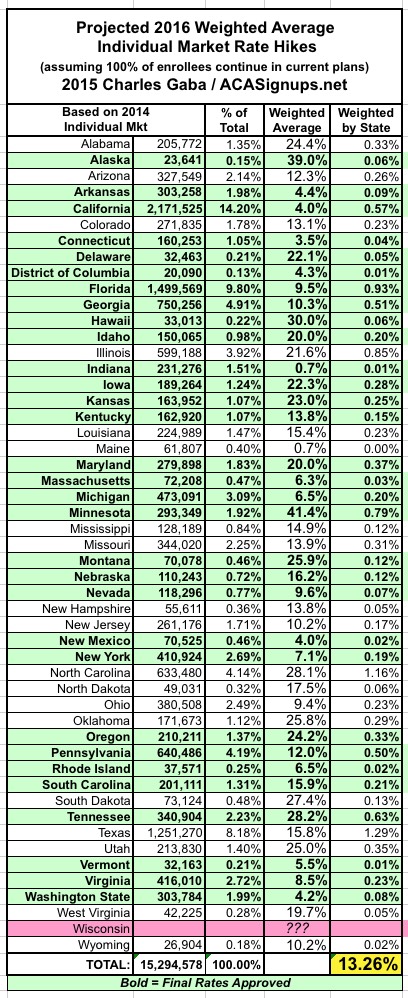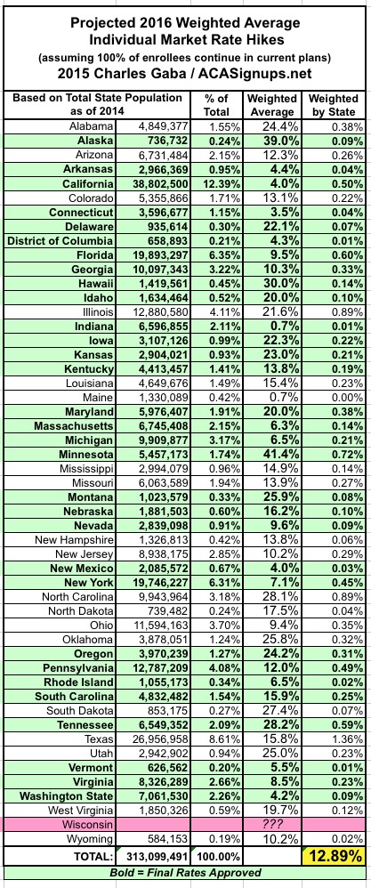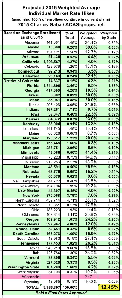 OK, so what I've done here is to take the overall weighted average 2016 rate increases for the ACA-compliant individual health insurance market for each state (requested in some states, approved in others) and plug those into a spreadsheet. Then, I've further weighted each state's average increase by that state's percentage of the national total, using 3 different criteria: Total Individual Market (as of 2014); ACA Exchange Enrollment Size (as of March 2015); and Total State Population Size (as of 2014). Again, the bold-faced/green states are ones where the 2016 rates have been approved; the rest are still requested only and could change dramatically in some cases.