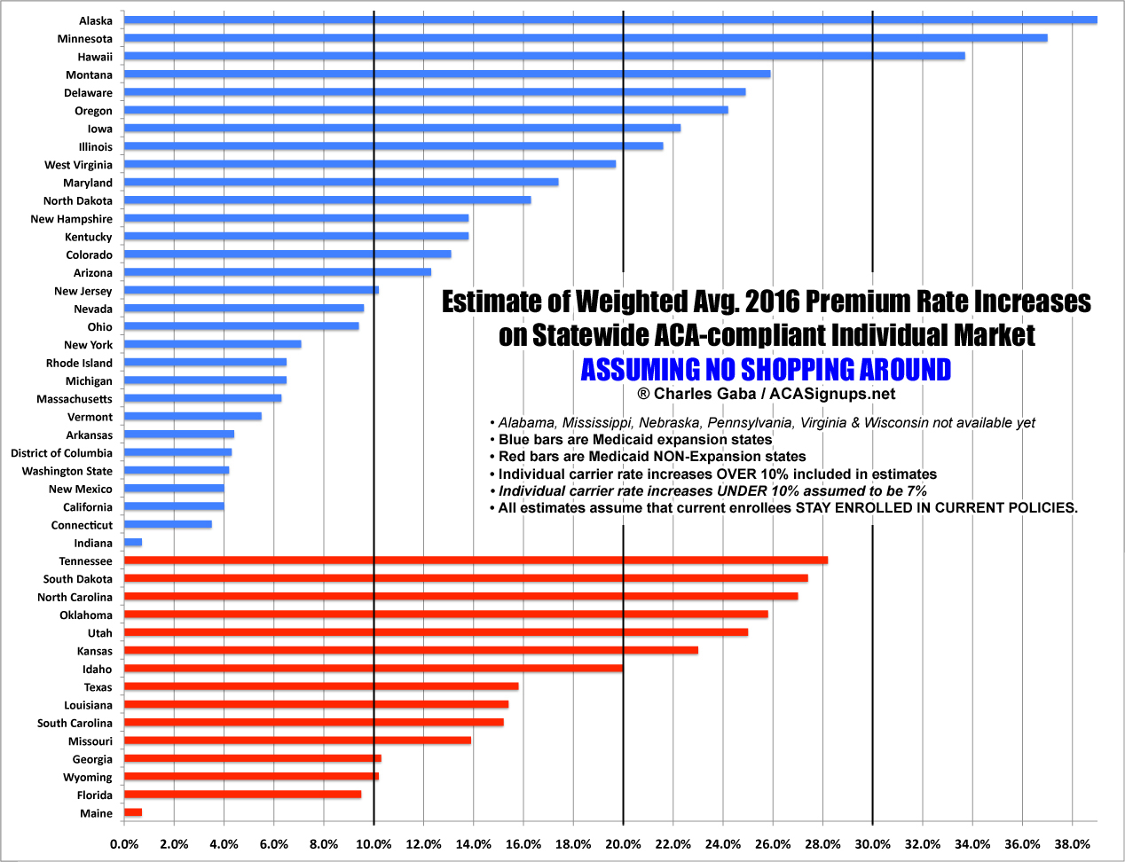 As I've plugged new states into my 2016 Rate Increase estimate project, many people have asked me whether I'm seeing any patterns emerging in terms of which states are seeing higher average rate hikes vs. lower ones. The main question being asked is whether Medicaid expansion seems to have an impact (and by extension, is there any sort of red/blue political pattern emerging).