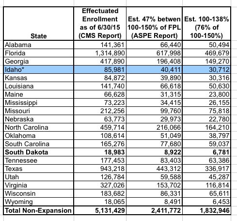 In South Dakota specifically, expanding Medicaid should mean that roughly 6,800 of the 19,000 residents enrolled via the exchange--a whopping 36% of the total--would likely be shifted off of their private policies over to Medicaid itself. The article linked to above estimates the total number eligible in SD at around 48,500; as far as I can tell, the remaining 41,700 are childless adults below 100% FPL and parents between 58% - 100% FPL.