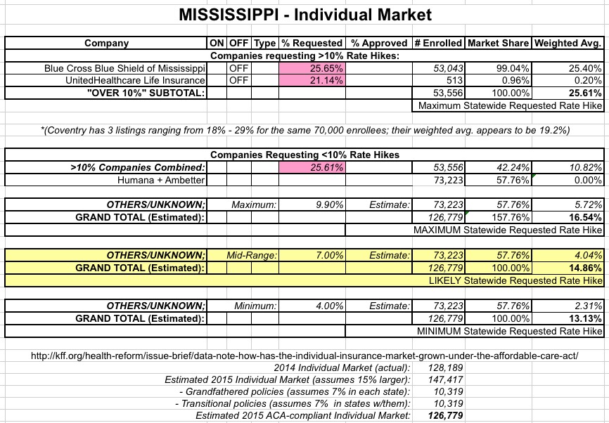 In Mississippi's case, this is flipped around: There appear to only be 4 companies offering individual policies in the entire state, and while I'm missing the enrollment number for the biggest one (BCBSMS), I can calculate a pretty close estimate due to a unique factor: Neither of the two asking for >10% hikes are offering exchange-based policies:
