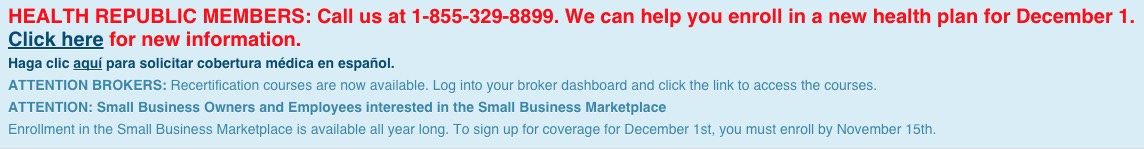 This was made worse by the fact that the November 30 cut-off wasn't even announced until October 30, and even then, the powers that be in the NY Dept. of Insurance, NY State of Health exchange and Health Republic itself didn't appear to treat this development with any particular sense of urgency. I mean yes, they posted notices about it and supposedly sent out letters to all 166,000 people, but an awful lot of those people didn't appear to have received those notices as of a few days ago. Hell, until a day or two ago the NY State of Health website didn't even have anything posted about the 11/30 cut-off at all.
