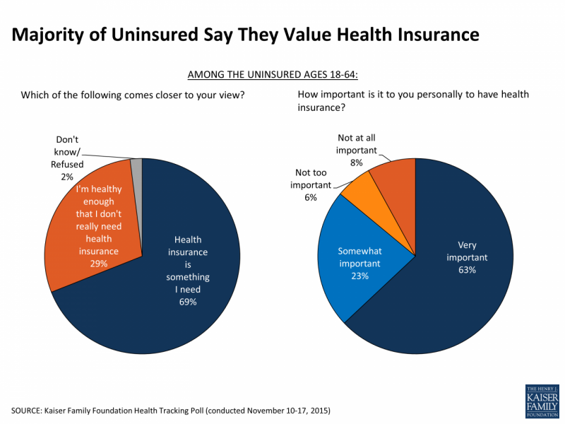 This month marks the start of the third open enrollment period under the health care law, which provides the opportunity to purchase health insurance on the exchanges and access to financial assistance, and the uninsured remain a key target for enrollment efforts. While 4 in 10 uninsured Americans (40 percent) report closely following news coverage of the health care law’s third open enrollment period, most say they value health insurance. Seven in 10 (69 percent) of the uninsured say health insurance is something they need, while 3 in 10 (29 percent) say they are healthy enough to go without. Additionally, the vast majority of the uninsured (86 percent) say it is at least somewhat important to them personally to have health insurance, including about 6 in 10 (63 percent) who say it is very important.