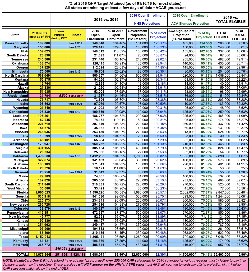 Note that whle the enrollment numbers for most states below are current through January 16th, most of the state-based exchanges are either slightly more current or up to three weeks behind.