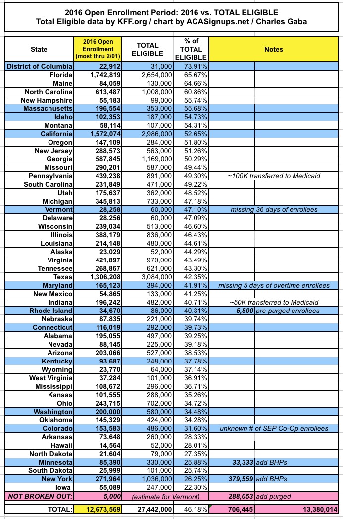 Again, KFF's more recent "potential enrollee" numbers have been updated (and increased by a couple million nationally) since I ran my numbers; here's what it looks like now:
