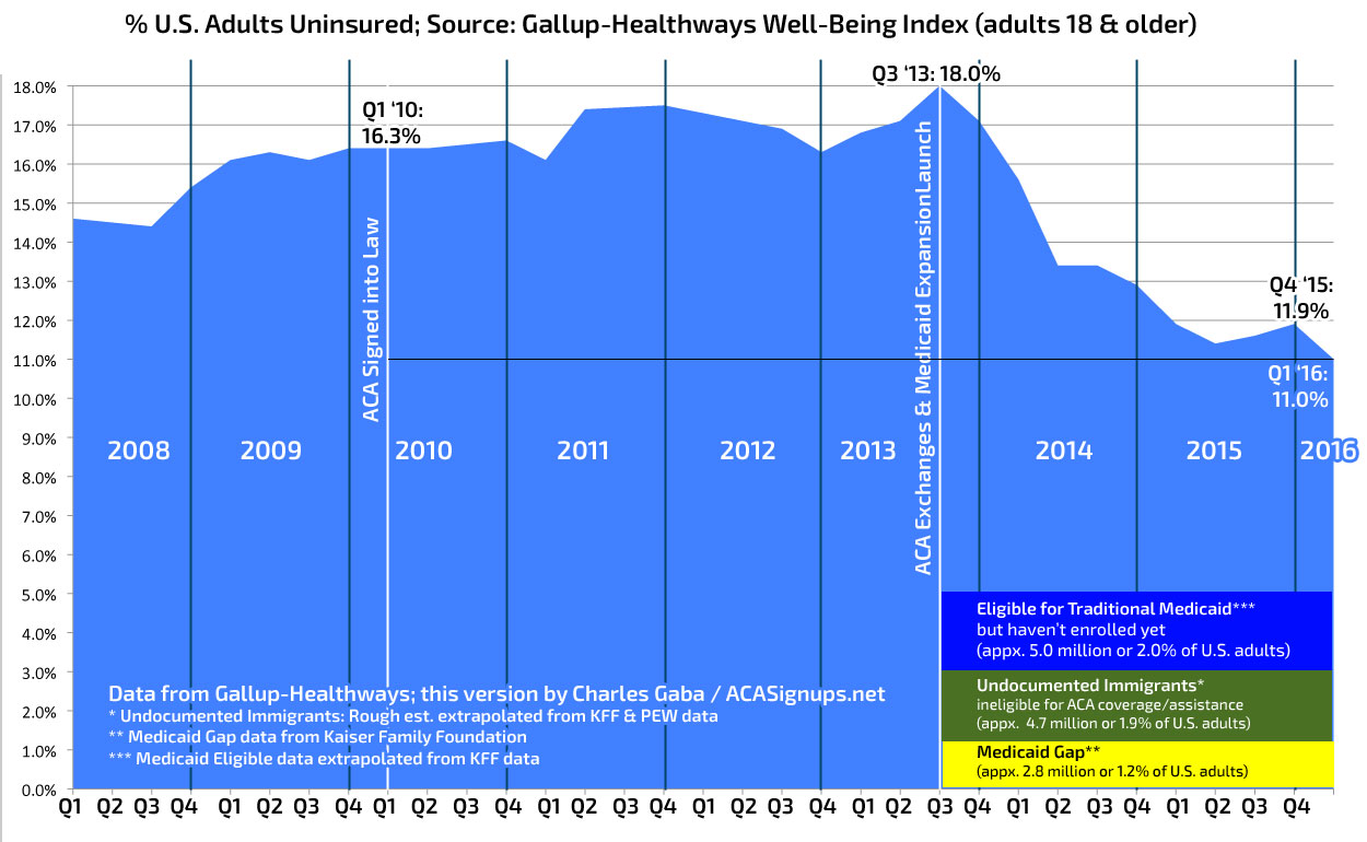 In the first quarter of 2016, the uninsured rate among all U.S. adults was 11.0%, down from 11.9% in the fourth quarter of 2015. This marks a record low since Gallup and Healthways began tracking the uninsured rate in 2008. The uninsured rate has declined 6.1 percentage points since the fourth quarter of 2013, which was right before the individual mandate provision of the Affordable Care Act took effect in early 2014 that required Americans to carry health insurance.