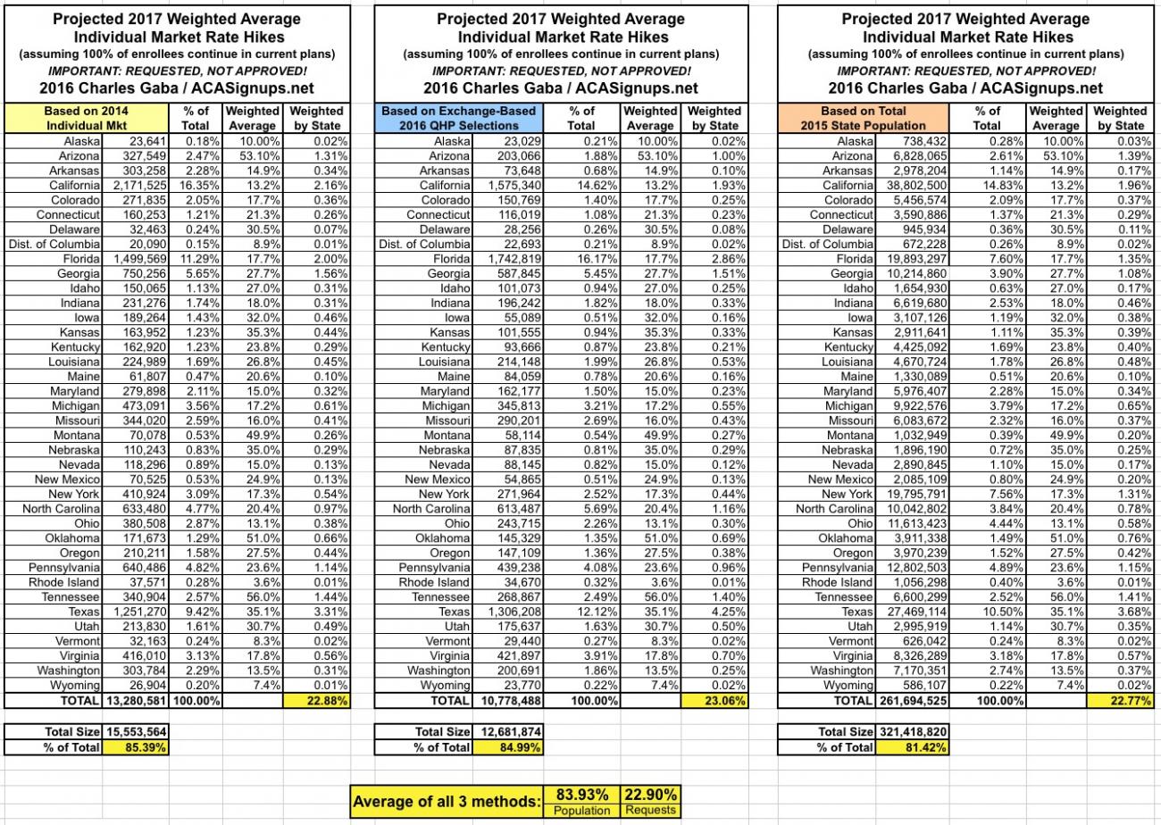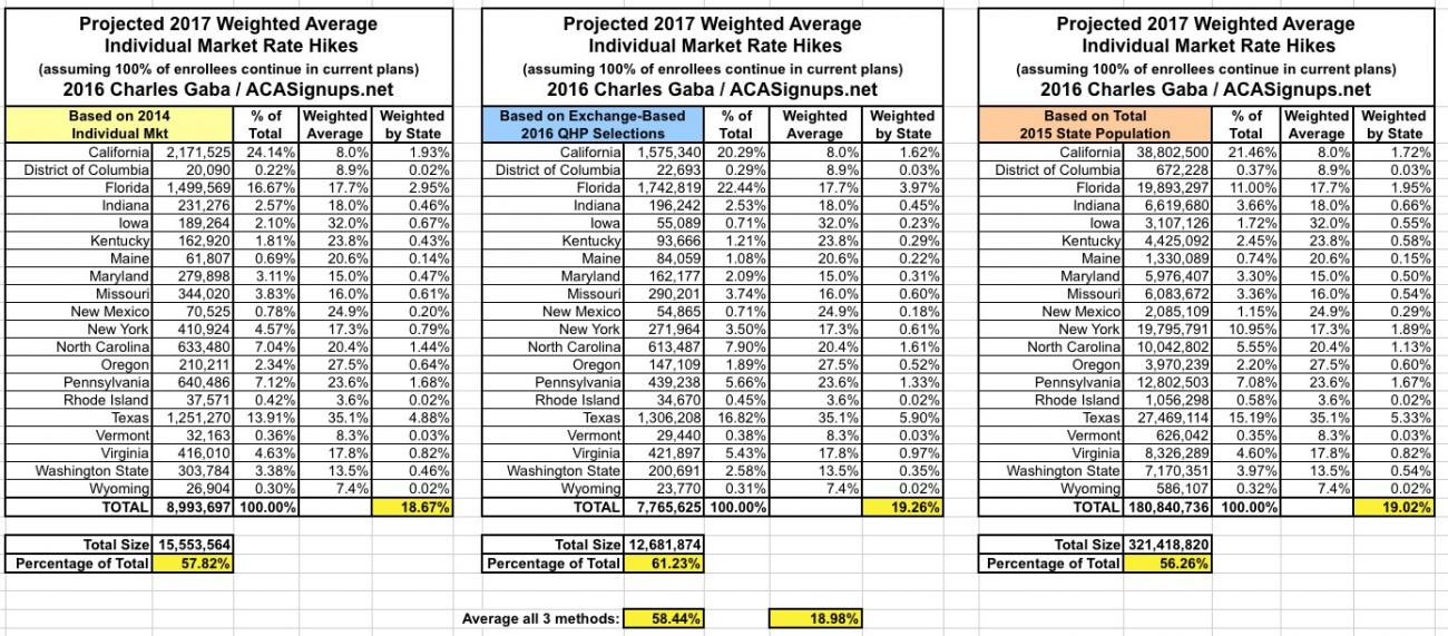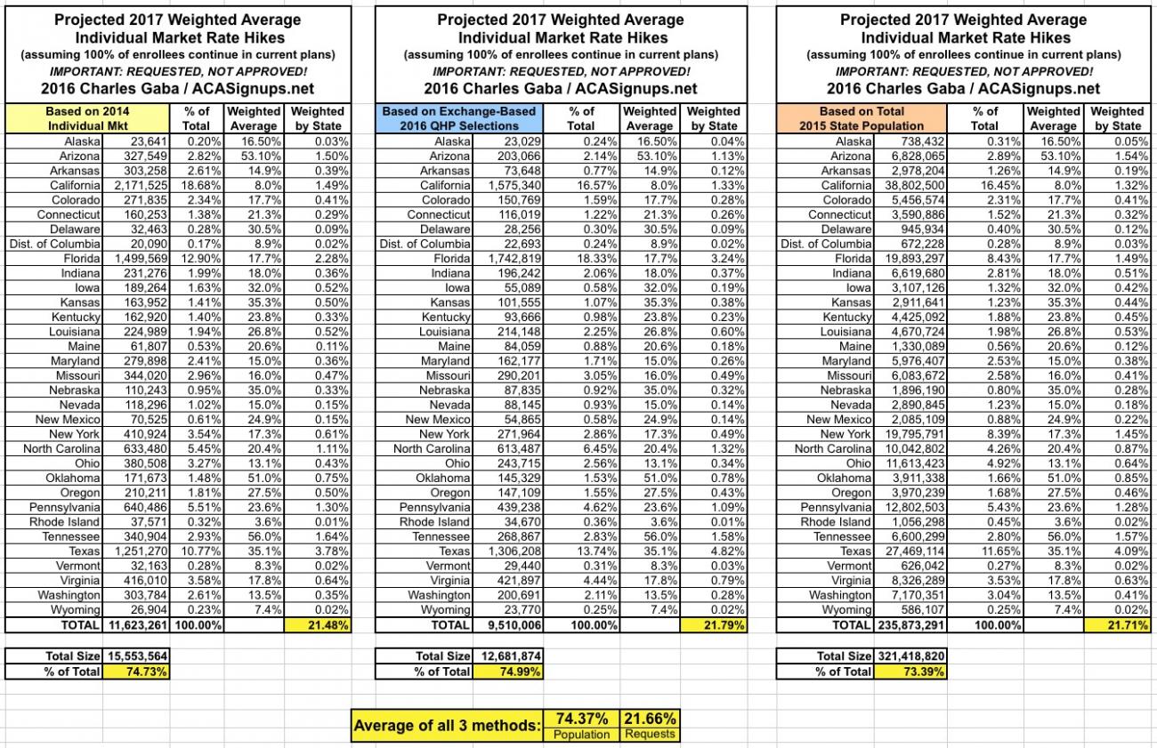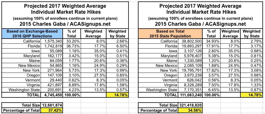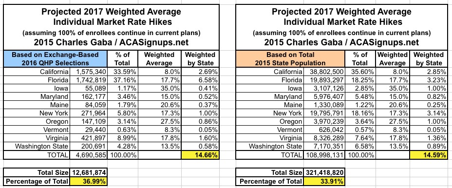 Since there are a lot of demographic variables which can skew the "average" up or down for any given state, last year I plugged the averages for each state into tables and weighted them based on 3 different criteria: The total (on plus off-exchange) individual market (based on 2014 data); the total exchange-based QHP selections as of the end of Open Enrollment; and the total population of each state. However, the 2014 data is too outdated by now (the national indy market has grown from around 15.6 million to around 20-21 million by now), so until the Kaiser Family Foundation or another trusted source compiles 2015 data, I'm dropping that method. Besides, all three methods still hovered in the same 12-13% range last year anyway.