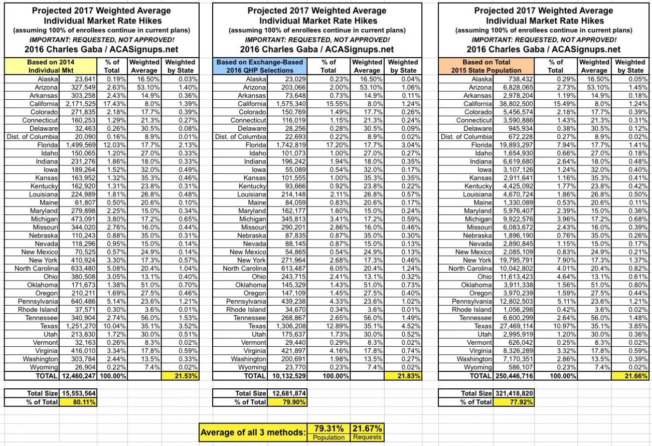 August 1st was the deadline for every state to submit their 2017 rate filings, meaning that the 14 states missing from my Requested Rate Hike Project are finally available to be plugged into the spreadsheet. I'll also be going back through the other states I've been tracking since as early as April to see which ones require updates due to carriers dropping out, joining in or resubmitting their rate requests.