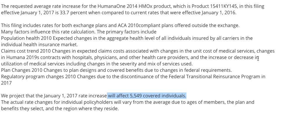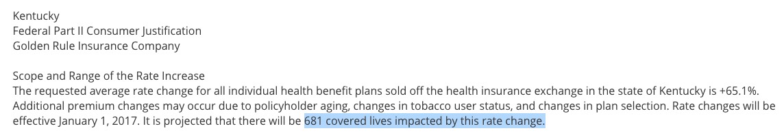 Not much to say about the bluegrass state...taken together, the 6 carriers offering individual policies in Kentucky appear to be requesting an average rate hike of 23.8%, ranging from Aetna's single-digits for a few hundred people up to Golden Rule's stroke-inducing 65% hike. One thing to note is that KY's total individual market was around 163,000 people in 2015, and is likely around 25% higher today (around 203,000), so over half of the market is likely missing from this table: