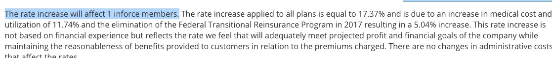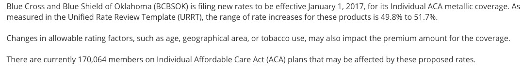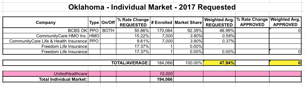 This is significant because there appear to be only 3 carriers offering individual policies in Oklahoma next year...one of which is the infamous "Freedom Life Insurance Co." which I wrote about last night. Since Freedom Life has (as usual) only a single enrollee in the state, it's really a nonfactor for calculating the weighted rate hike average.