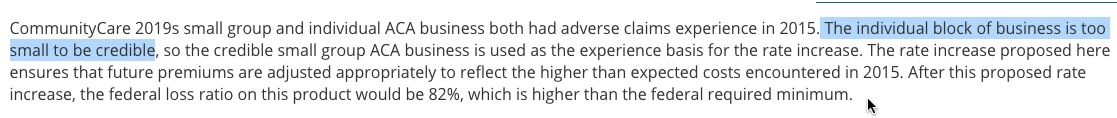 That leaves Blue Cross Blue Shield of Oklahoma, which has a whopping 170,000 enrollees...and CommunityCare (which is in turn broken into HMO and PPO divisions)...unfortunately, their rate filing doesn't include their enrollment number; all it says is that it's "too small to be credible" to be used as the basis of their rate hike request. In addition, UnitedHealthcare is dropping out of the OK indy market; I don't know how many enrollees they actually have.