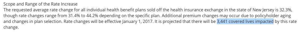 Yes, that's right...New Jersey appears to be among the very few states requesting average rate hikes of below 10% for 2017. This is mainly due to Horizon/BCBSNJ, which, unlike most other major carriers around the country is only asking for around a 6.2% average rate hike (again, this is a rough average based on the 4 filings below):
