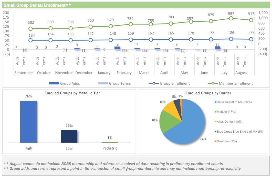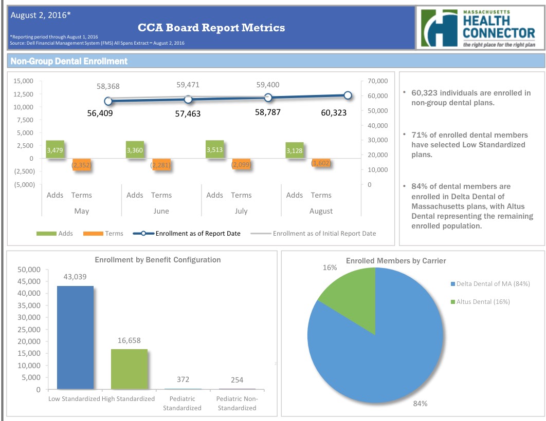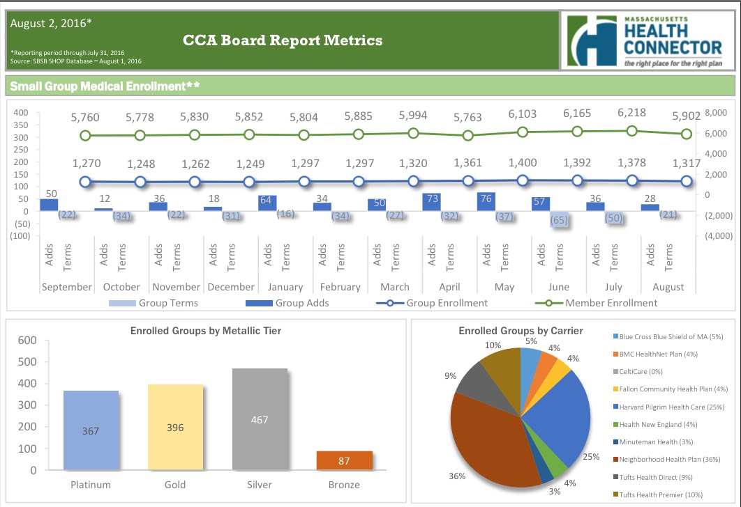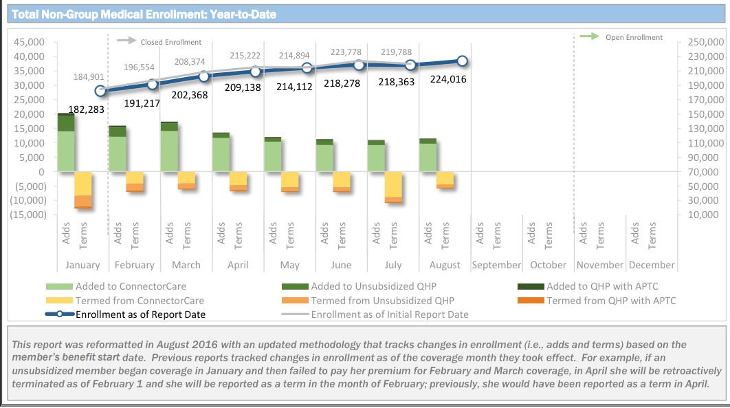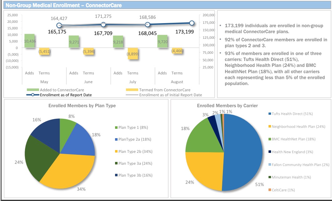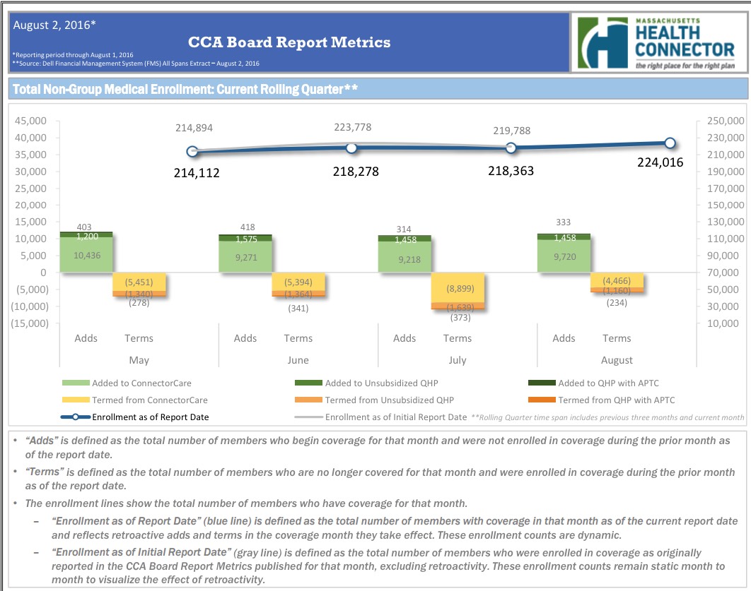 According to the dashboard report, as of August 1st, the MA Health Connector had 224,016 people enrolled in effectuated policies, or 8.2% more than they had at the end of March.