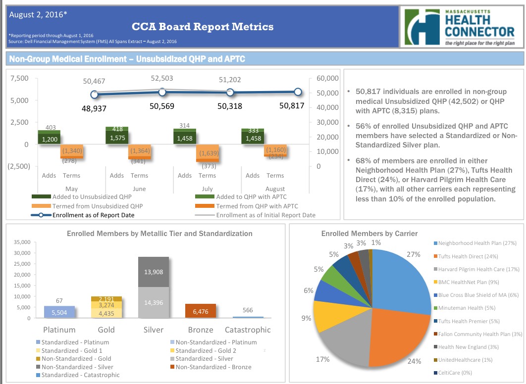 The Massachusetts Health Connector has posted their latest monthly enrollment report (through the end of July), and the news is good. As I note every month: