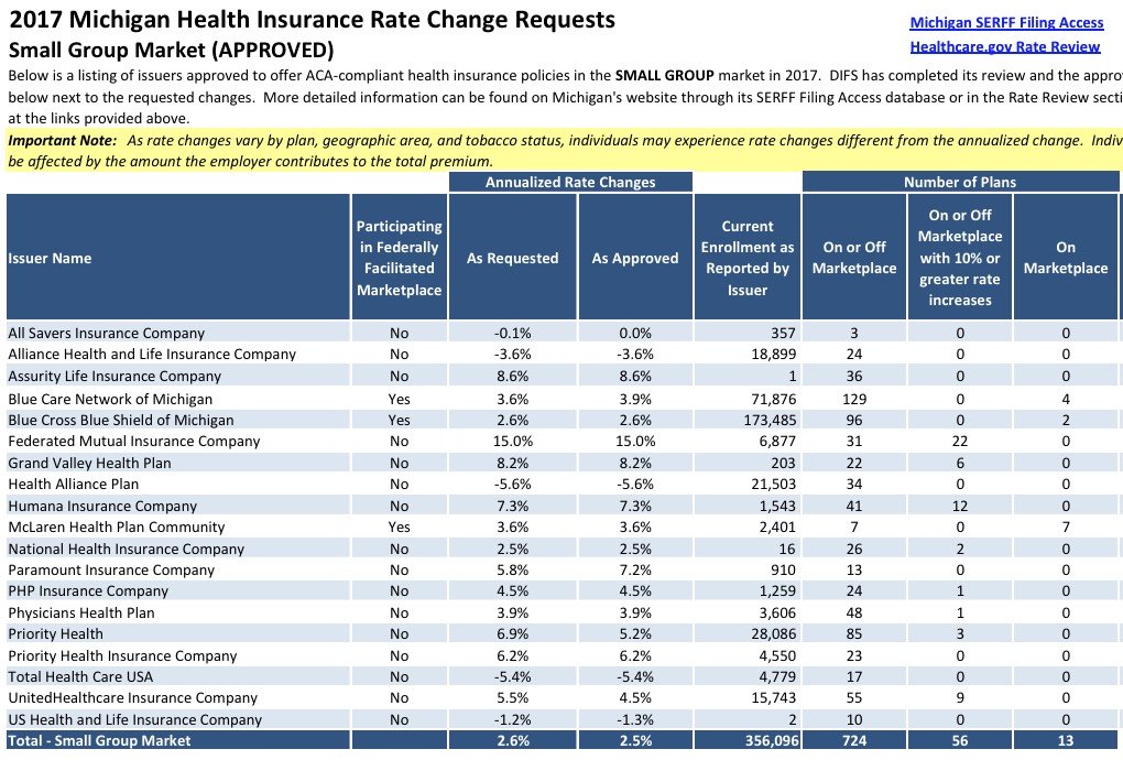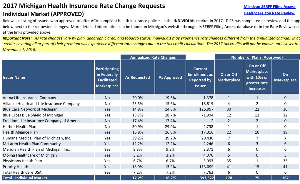 Right on top of Pennsylvania, the Michigan Dept. of Insurance has issued their final approvals for 2017 individual and small group market rate increases. As has been pretty typical this year, the final approved rates aren't all that different from what was requested; a little nip/tuck here and there, and the 17.2% average requested has been slightly trimmed to 16.7% approved for the indy market. Meanwhile, the small group average is barely noticeable: 2.6% requested, 2.5% approved. Unlike most states, the MI DOI has already done most of the heavy lifting for me, so I don't even have to use my own spreadsheet to calculate the weighted average.