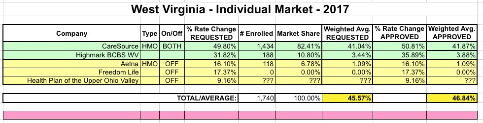 I'm not going to go into a whole lot of detail here, but I will post the updated spreadsheet tables for all five of these states. Combined, they actually bump the national average closer to 26% (mainly due to Texas's 34.1% average), but bear in mind that the requested average rate hikes for four of the still-missing five states came in well below 20%: