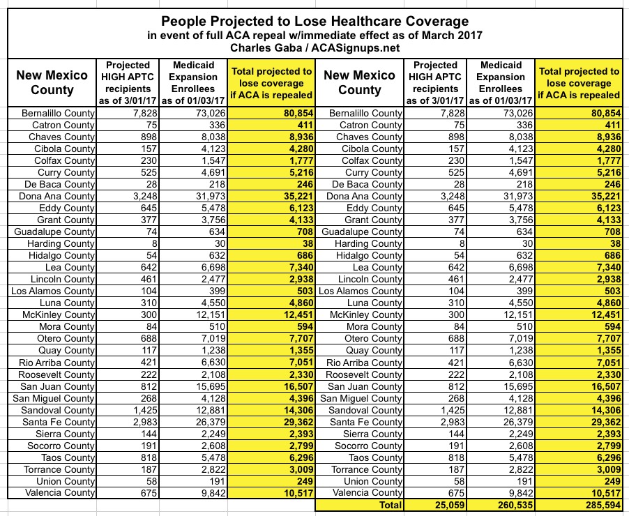 In New Mexico, assuming 57,000 people enroll in private exchange policies by the end of January, I estimate around 25,000 of them would be forced off of their private policy upon an immediate-effect full ACA repeal, plus another 260,000 enrolled in the ACA Medicaid expansion program, for a total of 285,000 residents kicked to the curb.