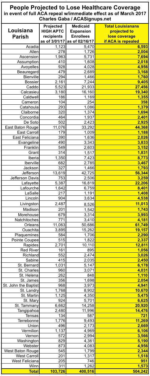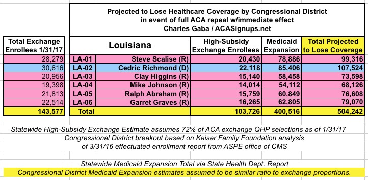 In the case of Louisiana143,000 people enrolled in exchange policies as of the end of January. Of these, I estimate around 103,000 of them would be forced off of their private policy upon an immediate-effect full ACA repeal, plus the additional 400,000 enrolled in Medicaid expansion, for a total of just over 500,000 Louisianans kicked to the curb.