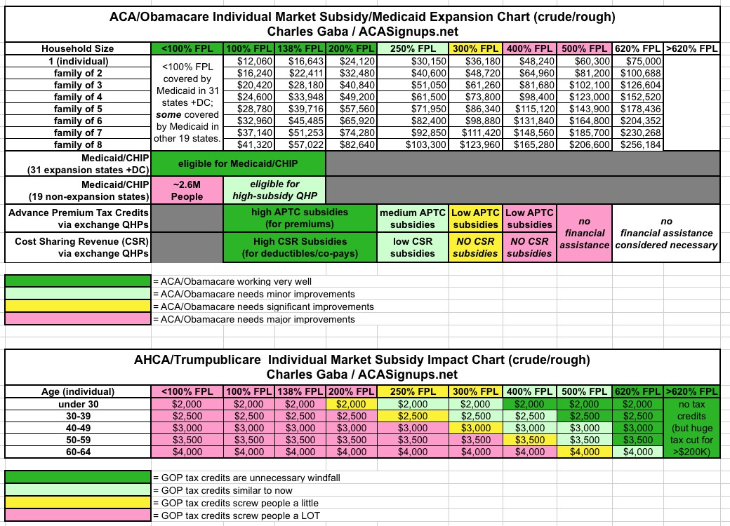 Well, the GOP plan does raise the cut-off line even further, to around 620% FPL ($75,000)...except that the dollar amount is locked in by age, regardless of your income within that range. A 25-year old earning just $20,000/year gets a $2,000 credit...but so does a 25-year old earning $75,000. Meanwhile, a 64-year old earning $20,000 only gets twice as high a credit ($4,000) even though he can be charged up to five times the premium, which doesn't make a damned lick of sense.