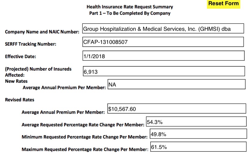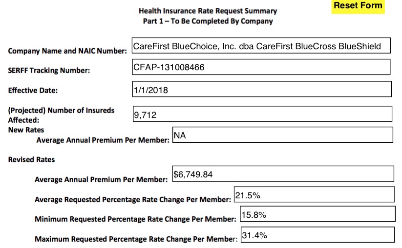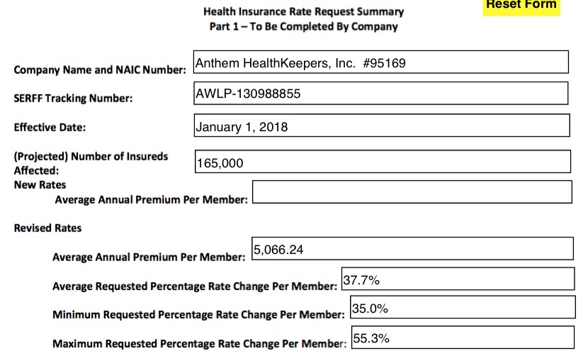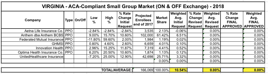 In any event, assuming all of the numbers below are accurate and that I'm not missing any major data points, it looks to me as though Virginia insurance carriers are initially requesting an unsubsidized, full-price, weighted average rate hike of roughly 30.6% on the individual market.