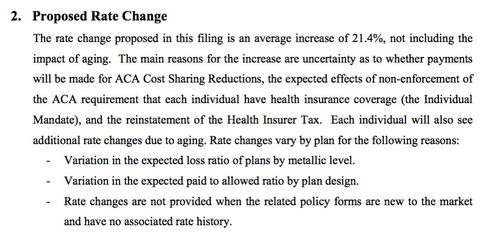 Cigna's filing hike request is a pretty ugly 42.1% overall...but they clearly state that a full 14.1 percentage points of this...or a solid third...is due specifically to Donald Trump and the Congressional GOP's threats to cut off the legally-owed Cost Sharing Reduction reimbursements due to the carriers. They also make a reference to Trump/Tom Price's threats not to enforce the individual mandate (by way of the increased morbidity profile expected for next year), but don't specifically break that part out. Without the CSR sabotage threat, however, they clearly state that they'd "only" be requesting a 28% increase (still ugly, but not as bad as 42%).