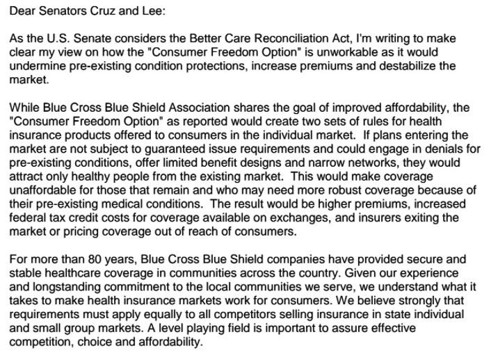 I should note that America's Health Insurance Plans and the Blue Cross Blue Shield Association, the two largest insurance trade groups, are appalled by the Cruz-Lee amendment:
