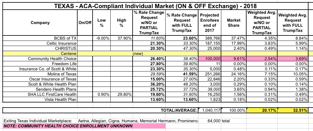 Whew! OK, Texas was a bear for obvious reasons...13 different carriers (well, 12 really...Centene is new to their market). Several more are dropping out (Aetna, Allegian, Cigna, Humana, Memorial Hermann and Prominence), but suposedly theyonly have around 64,000 enrollees in TX combined. Texas's total individual market is actually closer to 1.6 million, so I'm obvoiusly missing a big chunk of enrollees below (and before my regular commenters say it: Yes, I'm sure the off-exchange TX indy market has shrunk this year, but I find it hard to believe it's shrunk by over 60% already).