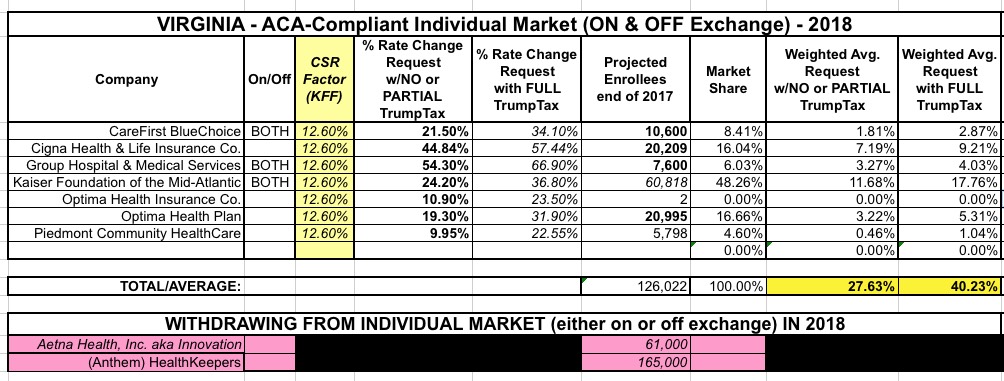 UnitedHealthcare had previously announced they were dropping out of Virginia, but I didn't have an enrollee number for them, and Aetna had also just announced their withdrawl from the state. I hadn't yet finalized my "CSR/Mandate Penalty" factor layout yet; at the time I assumed the 30.6% weighted average requested assumed full CSR/mandate sabotage and reduced that number by 17 points based on the Kaiser Family Foundation's "19% national average CSR rate hike" estimate analysis, which estimated the CSR impact at 17 points for Virginia.