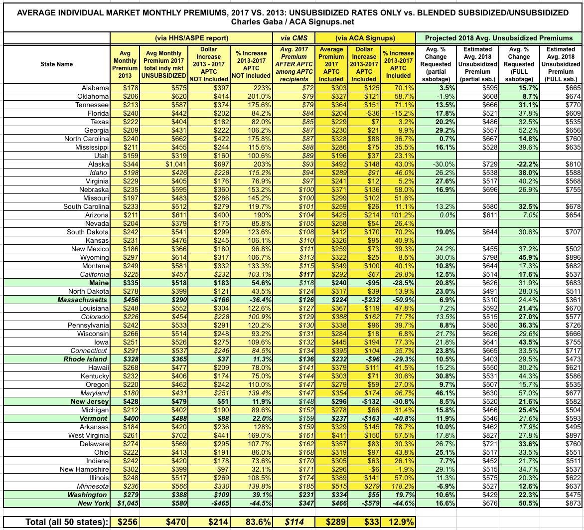 As I noted when I debunked/corrected the ASPE report, not only did it turn out to be somewhat lower when all 50 states were included (84%, not 105%), but the ASPE report completely ignores both the financial assistance provided to roughly half the market and, just as importantly, blows off the apples to oranges mismatch between the numbers, because only a handful of states had guaranteed issue laws in 2013, and only one (NY) had a community rating law. Having said that, as long as you keep those caveats in mind, the (corrected) ASPE report does provide a good baseline for figuring out what the 2018 premiums are likely to be.