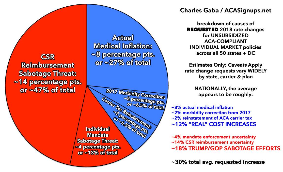 With these updates, here's what it looks like now: Trump/GOP sabotage is still responsible for a good 60% of the requested rate increases (~18 points), while "legitimate" price increases make up the other 40% (~12 points).
