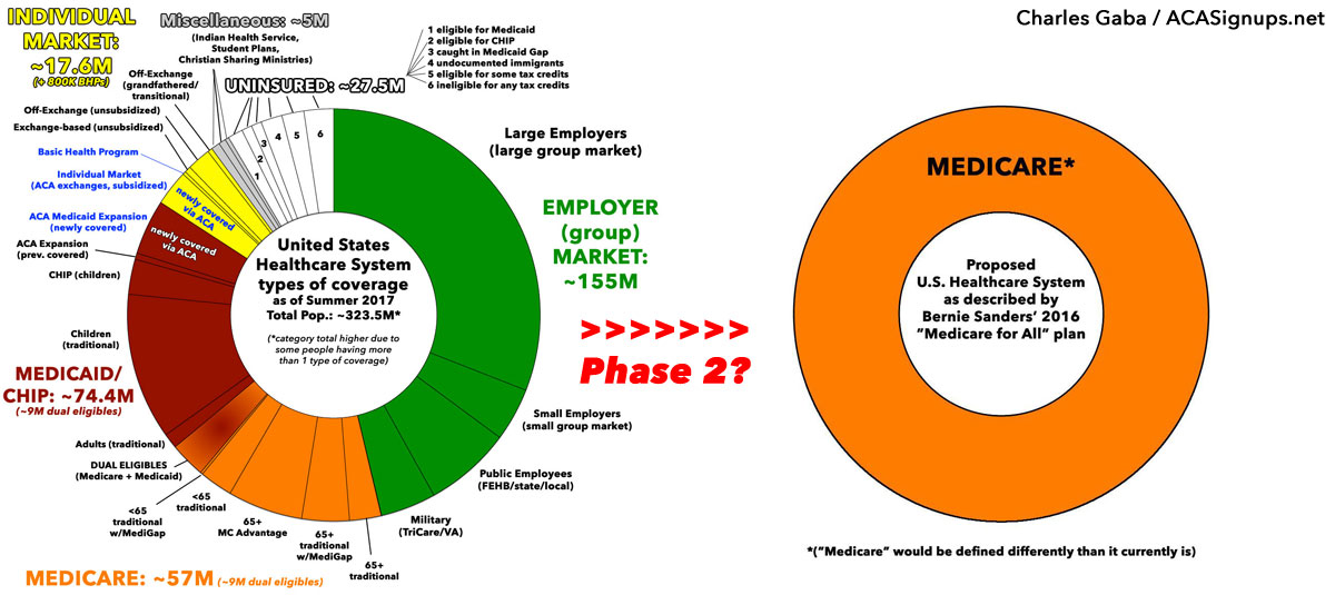 "Team Bernie", in essence, consisted of progressives (and Democrats) who believe that while the ACA may have improved things to some degree in some ways, it not only isn't enough long-term, it isn't nearly enough short-term either; the next step (and for many, the only acceptable next step) must be moving the entire U.S. population over to a universal Medicare-style Single Payer system, with everyone in the country being covered through a single, comprehensive healthcare program funded entirely (or nearly entirely) by taxes.