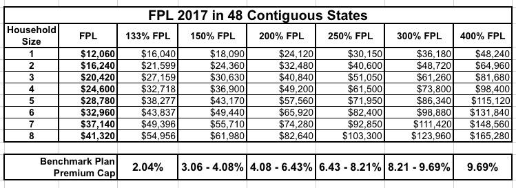 ...and here's the table showing where the income brackets are for the different Federal Poverty Level ranges: