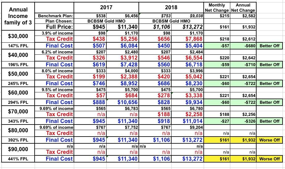 Assuming the Benchmark Plan increases by about 40%, here's what the 2018 costs would look like if they stick with the same plan before and after tax credits are applied: