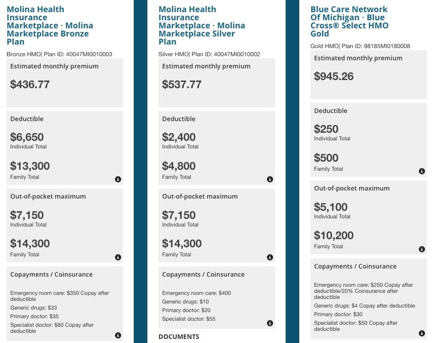 Here's their Bronze, Silver and Gold options. Remember, I'm going with the cheapest Bronze, 2nd cheapest (Benchmark) Silver and mid-range Gold in all cases: