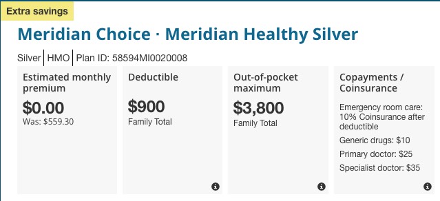 Here's what that does for this family next year. The "Meridian Choice" plan is no longer the benchmark Silver; the price for that plan has increased by $91/month...but the new Benchmark Silver, BCN's "Blue Cross Detroit Silver Saver", only costs $488/month...just a couple dollars more than the Meridian does this year. In addition, the deductible on the new benchmark plan is $4,300 lower than the Meridian plan is this year. this family would probably be better off switching to it, assuming their doctors/hospitals are still in network: