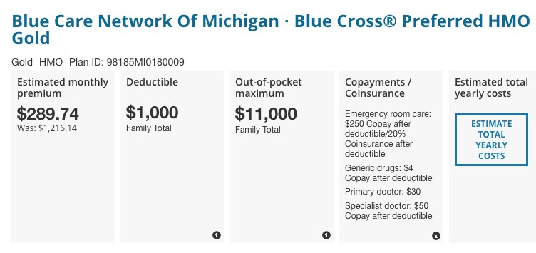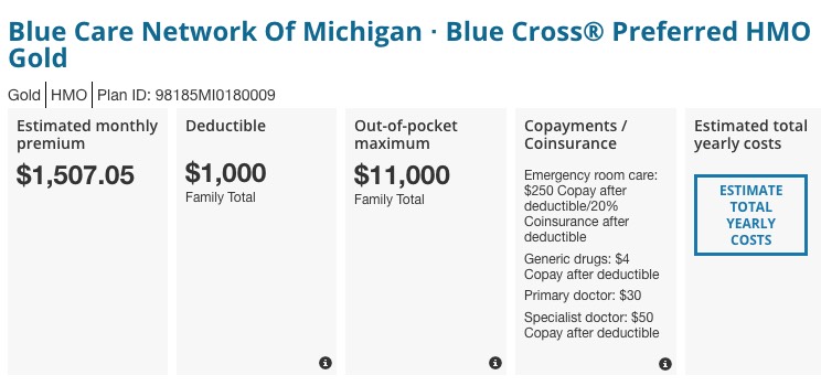 How about the BCN Gold HMO, however? Again, the slightly different plan has a $500 higher decuctible...but the premiums have gone down by $47/month, or $564/year. This is basically a wash year over year.