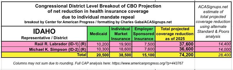 One more thing, however: In addition to the Congressional Budget Office projections, I've also included my own CD-level breakout of the lower coverage loss projections estimated by Standard & Poors. Unlike the CBO's 13 million projection, S&P estimates that only around 5 million people at most would lose coverage over the next several years if the ACA's individual mandate were to be repealed (without other significant changes to the law).
